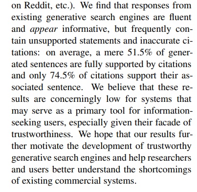 Zespół naukowy z Uniwersytetu Stanforda przetestował wyżej wymienione wyszukiwarki pod kątem wiarygodności. Sprawdzili, czy gdy wyszukiwarka coś twierdzi, to potrafi wskazać skąd ma tę wiedzę, a gdy wskazuje skąd, to czy faktycznie pod wskazanym adresem są informacje zgodne z tym, co mówi wyszukiwarka. Okazuje się, że średnio zaledwie nieco ponad połowa zdań wygenerowanych przez te wyszukiwarki ma pokrycie w cytatach ze źródeł. Cytat nie gwarantuje wcale bezbłędności, bowiem niecałe 75% cytatów potwierdza streszczenia, podsumowania czy zdania wygenerowane przez te wyszukiwarki.
