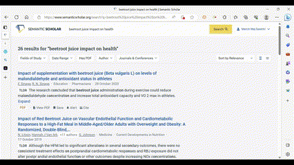 Podobnie jak Elicit działa również SemanticScholar.org. W tej kolejnej usłudze jednak nie można zadać pytań w języku naturalnym. Wpisujemy hasłowo, jak w starym Google słowa-klucze do wyszukiwania. Czyli w tym przypadku to byłoby po prostu „beetroot juice” (sok buraczany) lub dla lepszego wyszukiwania „impact of beetroot juice on health” (wpływ soku buraczanego na zdrowie).