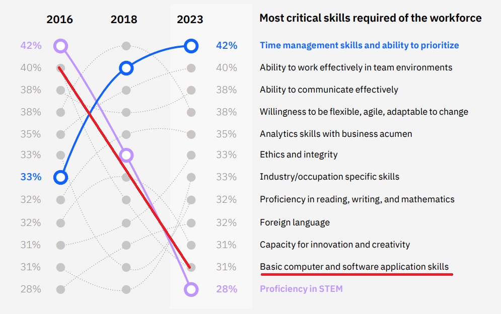 Najciekawsze dane natomiast dotyczą tego, jak w kolejnych edycjach tego badania (2016, 2018, 2023) ludzie odpowiadali na pytanie: jakie są Pana/Pani zdaniem najważniejsze umiejętności i kwalifikacje na rynku pracy? Okazuje się, że od 2016 roku znacząco mniej ludzi uważa, że do pracy dziś potrzeba umiejętności obsługi komputera oraz aplikacji komputerowych (!) a także znacząco mniej ludzi dziś uważa, że do pracy potrzeba wykształcenia technicznego, matematycznego i myślenia krytycznego (!) – STEM skills.