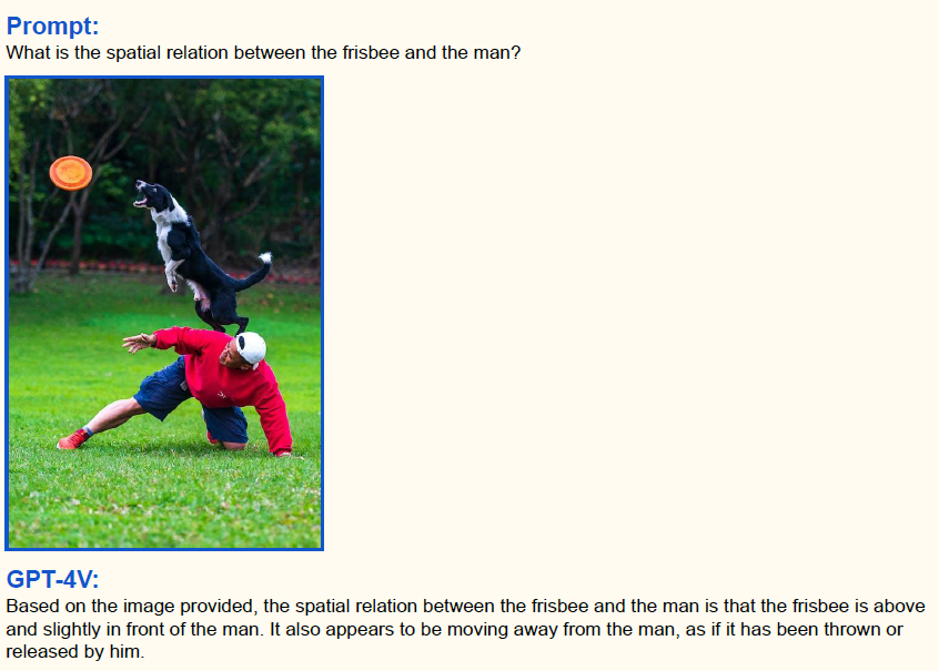 Czat GPT-4 dostał zdjęcie człowieka rzucającego frisbee psu i pytanie, w jakiej relacji przestrzennej znajdują się człowiek i talerz. Odpowiedział, że patrząc na zdjęcie, to frisbee znajduje się nad człowiekiem, lekko z przodu i wygląda, jakby oddalało się od człowieka, jakby było przez niego rzucone lub wystrzelone.