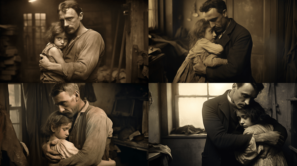 1920, a man holding a 7-years old girl in his arms, looking at each other, poor apartment, melancholic atmosphere, farewell, photo style from 1920 --ar 16:9 (1920, mężczyzna trzymający na rękach 7-letnią dziewczynkę, patrząc na siebie, biedne mieszkanie, melancholijna atmosfera, pożegnanie, fotografia w stylu tych z 1920)