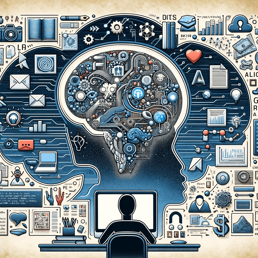 Prompt: An illustration depicting a human user sitting at a computer with the GPT chat interface displayed. The image includes a symbolic representation of artificial intelligence, like an abstract neural network or a digital cloud, encompassing various aspects of the text such as education and the creative industry. Additionally, there are elements like books, documents, art images, and programming code to illustrate the wide range of GPT chat applications. Emotional symbols like awe, fear, and curiosity are included to represent the diverse public reactions to the technology.