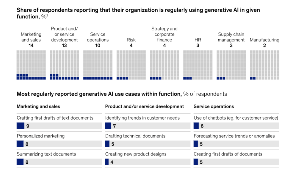 Po około roku z gen-AI korzysta aż 14% personelu w marketingu i 13% w działach rozwoju produktów/usług? Dla mnie to bardzo dużo – nawet jeśli to self-reporting i wynik zawyżony. Warto zwrócić uwagę na zastosowania tego rodzaju sztucznej inteligencji – przede wszystkim przyspiesza tworzenie dokumentów oraz obróbkę tekstów (streszczanie, przepisywanie, personalizowanie).