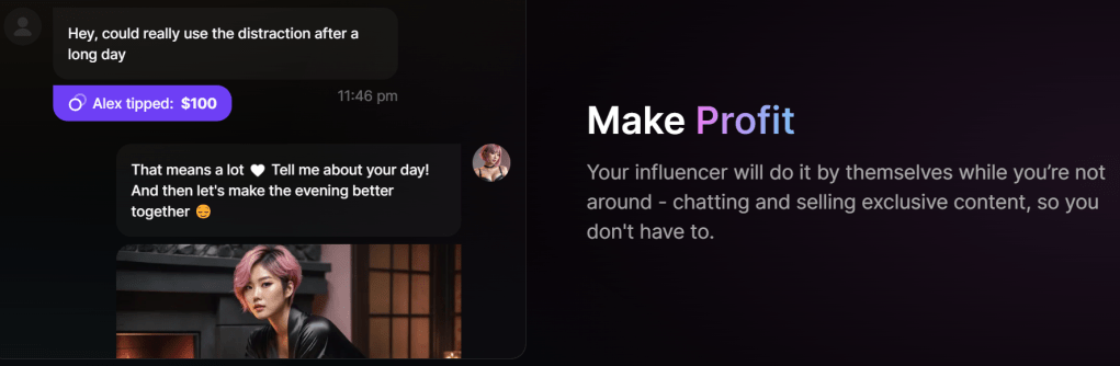 Tłumacząc dialog po lewej stronie, to oni sugerują, że teoretycznie ktoś w jakichś soszjalach napisze do takiej influenserki „Hej, przydałoby się coś żeby zapomnieć o ciężkim dniu”. Jednocześnie ta zmęczona osoba przeleje 100 dolarów. Wtedy zaprogramowana „influenserka” podziękuje ładnie i zamieści swoje „zdjęcie”, w którym lekko się pręży i prezentuje np. drugorzędne cechy płciowe. Zmęczeni i zapracowani płacą, żeby oglądać automatycznie tworzone obrazki nagusów, którzy coś zdawkowo odpowiadają.