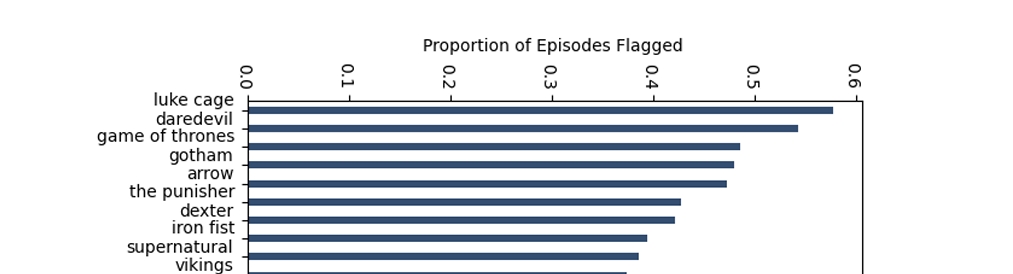 Najwięcej zmian moderacja czata w trybie automatycznym dokonałaby w serialach Luke Cage, Daredevil, Gotham, Gra o Tron i Arrow. W odcinkach tych seriali więcej niż połowa odcinka nadawała się do zmiany. Oto wykres prezentujący 10 seriali, gdzie zakres moderacji był największy (proportion of episodes flagged).