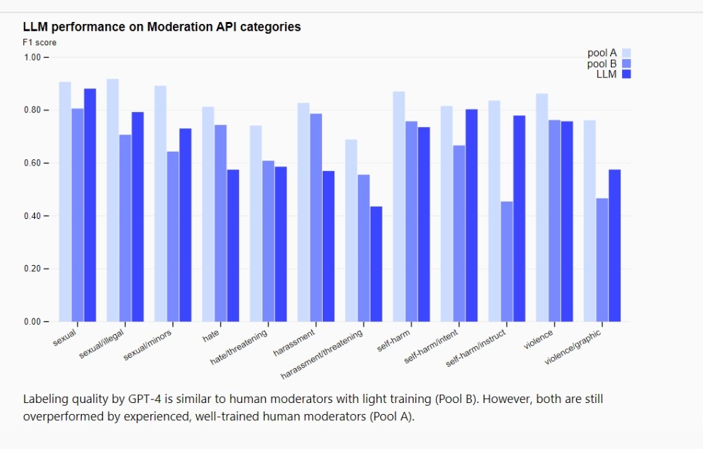 Czego nie umie moderować czat? Tego nie było w omawianej pracy, ale zajrzałem do dokumentacji czata. Najgorzej automatyczna moderacja radzi sobie z wykrywaniem czy oznaczaniem treści dotyczących gróźb i prześladowania (harrasment/threatening). W tym przypadku różnica między ludźmi a czatem jest największa na korzyść ludzi. Model GPT4 jest lepszy niż wstępnie przeszkoleni ludzie, ale gorszy od gruntownie przeszkolonych moderatorów ludzkich.